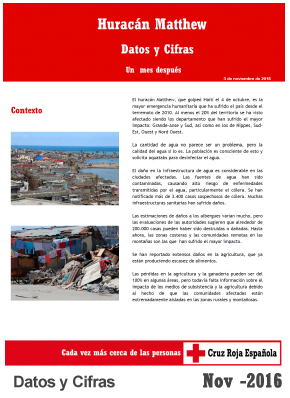 El huracán Matthew ha sido uno de los huracanes más poderosos que ha golpeado el Caribe en la historia reciente, las lluvias torrenciales y vientos de Matthew han inundado pueblos y han destruido carreteras, casas y edificios. La Federación Internacional ha lanzado un llamamiento de emergencia por 6,8 millones de francos suizos (6,9 millones de dólares) para brindar asistencia médica, refugio y agua y saneamiento a 50.000 personas en el suroeste, zona devastada por la tormenta en Haití.